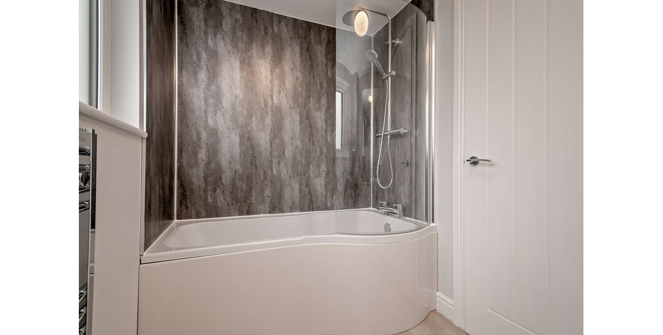 A modern installation, with premium quality laminate flooring, plenty of storage capacity. Appliances include: an electric oven, with four ceramic hobs and a fitted extractor fan. There is also space for a free-standing washing machine and an American fridge freezer. There is a 1.5l stainless steel sink and drainer and a pantry adjacent. Double Glazed windows to the rear aspect, and a Central Heated radiator. Note: There are no properties overlooking from the rear.