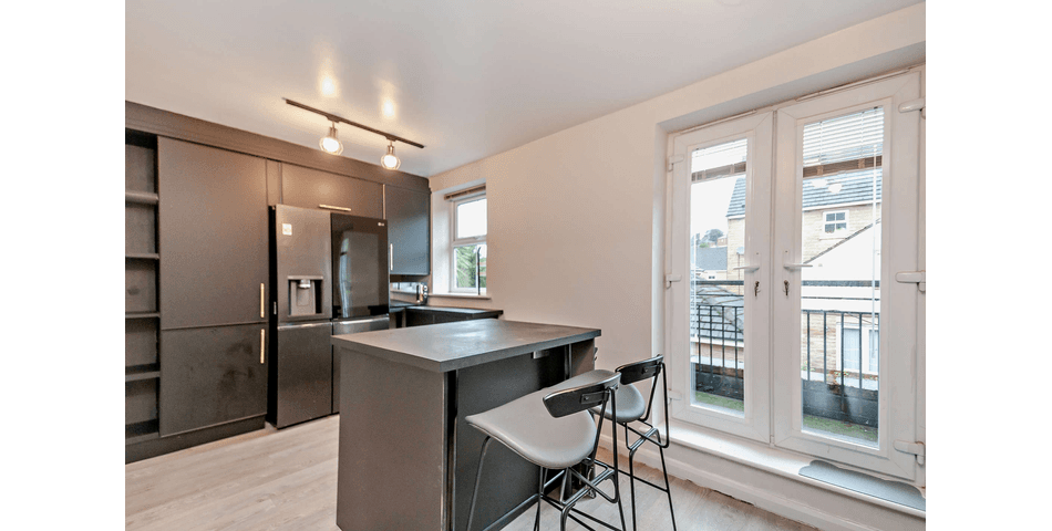 A well presented modern kitchen which enjoys a mobile breakfast bar (not fitted) and two stools. Features include: a 2l capacity sink, premium splash-back wall tiling, a fully fitted electric double oven and five gas ‘ring’ hobs with an extractor above. There is a good amount of storage space and supported ‘freestanding ’appliances include: a dishwasher and a large American style fridge freezer. Double Glazed windows to the rear elevation and Double Glazed French doors which lead onto a private balcony (2.80m x 1.35m) which overlooks the rear garden and is spacious enough to support some exterior seating furniture (lovely in the warmer months).